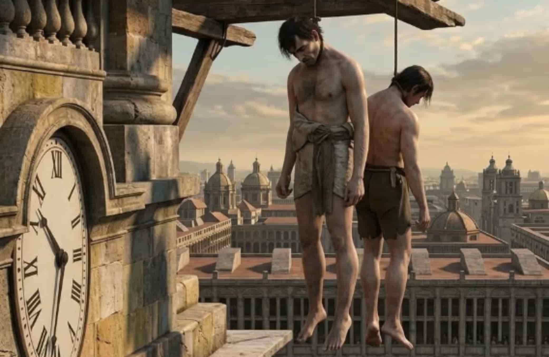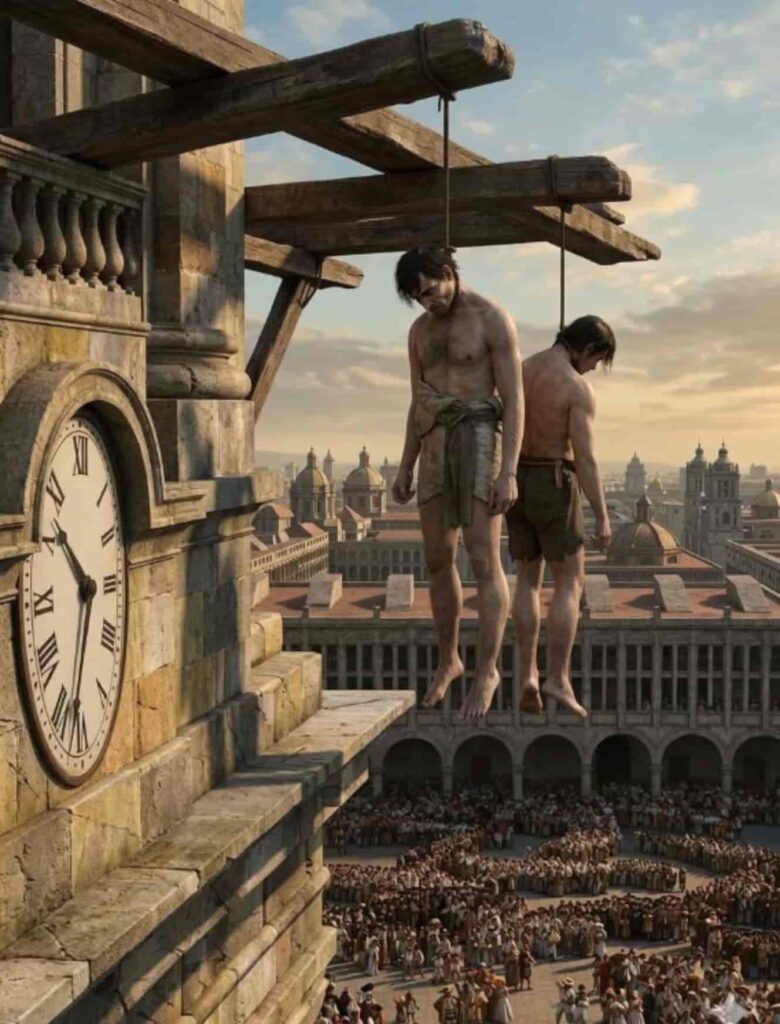 En la ilustración “Tomás Gutiérrez y Silvestre Gutiérrez (el primero, autodenominado presidente de la República y el segundo su hermano y compañero) colgados en la Catedral de Lima”.